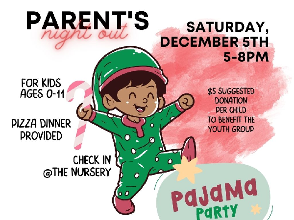 Kids 0-11yrs are invited to come have a pajama party while the parents go out and enjoy some adult-time: Catch a movie, do some shopping, enjoy a meal with other PNO friends or sit in your car and enjoy the silence!